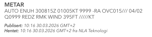 Vi henter TAF/METAR fra api.met.no for alle flyplasser i Norge, Sverige, Danmark og Finland.