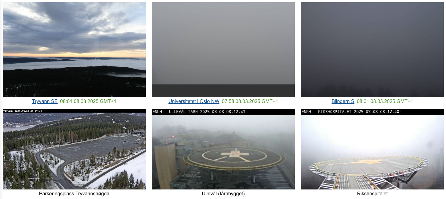 Bildene under er gode eksempler på hvorfor Tryvann kan være viktig for å få alvorlig syke og hardt skadde pasienter raskt til de store sykehusene. Øverst til venstre ser vi at været ligger som et lokk over Oslo. I midten og til høyre ser vi at tåka ligger tjukk ved Blindern. Bildene nederst viser at parkeringsplassen på Tryvann har god sikt, mens landingsplassene på Ullevål sykehus og Rikshospitalet er dekkes av tåke. Hvis det hadde kommet et legehelikopter på vei til Oslo med en pasient kunne de ikke ha landet ved sykehusene. I god tid kunne de ha avtalt å møte ambulansen på Tryvann. Sett fra Oslo var det umulig å si noe om været i høyden.